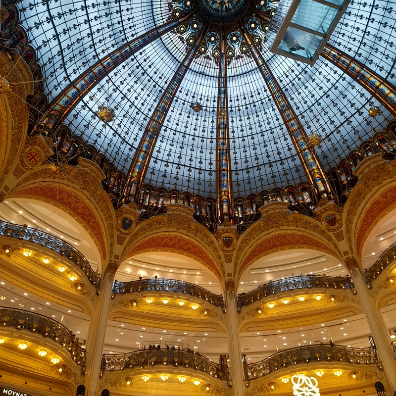 Wir beschließen auch heute wieder viel zu Fuß zu entdecken. So kommen wir an der Galerie Lafayette vorbei und entdecken auf der Dachterrasse Paris von oben.